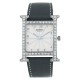 Montre bracelet grand modèle en acier, cadran argenté stylisé avec chiffres arabes, lunette à décor de ''H'' rehaussée de diamants. Bracelet rapporté en cuir gris avec boucle ardillon en acier. Signée et numérotée.