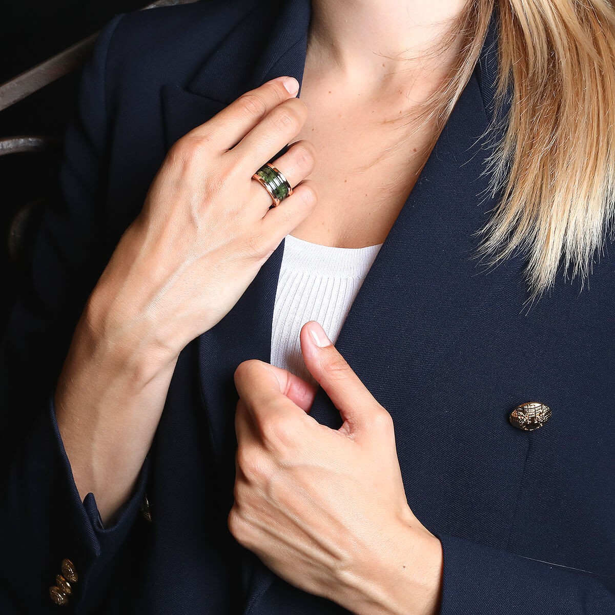 Bague en or rose et marbre vert, stylisant un large anneau en spirale gravé Bvlgari. Signée et numérotée.