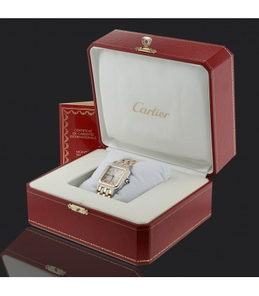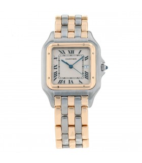 Montre bracelet grand modèle en or jaune et acier, cadran argenté avec chiffres romains peints, chemin de fer pour les minutes, affichage de la date par guichet à 3 heures. Mouvement quartz. Bracelet 3 rangs d’or jaune et acier, maillons articulés avec boucle déployante en acier. Signée et numérotée.