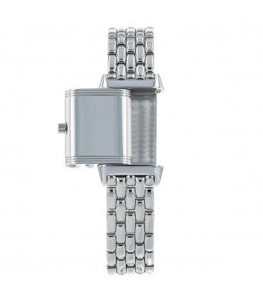Montre bracelet de femme en acier, cadran argenté avec chiffres arabes peints, chemin de fer pour les minutes, boîtier réversible. Mouvement quartz. Bracelet acier, maillons articulés avec boucle déployante en acier. Signée et numérotée.