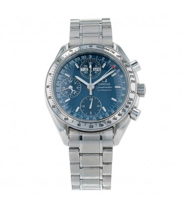 Montre chronographe en acier, cadran bleu rayonnant 3 compteurs avec index appliqués, affichage du jour et du mois en anglais, de la date par aiguille, lunette gravée d’un tachymètre jusqu’à 500 units par heure. Mouvement automatique. Bracelet acier, maillons articulés avec boucle déployante en acier. Signée et numérotée.