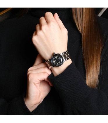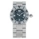Montre bracelet de femme en acier, cadran noir stylisé avec chiffres romains et index luminescents, affichage de la date par guichet à 6 heures, lunette tournante graduée. Bracelet en acier, maillons articulés avec boucle déployante en acier. Signée et numérotée.