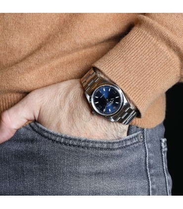 Montre bracelet en acier, cadran bleu rayonnant avec chiffres arabes et index bâtons appliqués. Mouvement automatique. Bracelet acier, maillons oyster avec boucle déployante réglable en acier. Signée et numérotée réf. 14000.