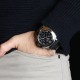 Montre chronographe en acier, cadran noir 3 compteurs avec chiffres arabes et index luminescents, petite trotteuse à 9 heures, affichage de la date par guichet à 4 h30 heures, second fuseau horaire, lunette graduée d’un tachymètre de 400 units par heure. Mouvement automatique. Bracelet en caoutchouc noir avec boucle déployante réglable en acier. Signée et numérotée. Série limitée à 1200 exemplaires.
