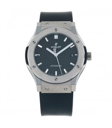 Montre bracelet d’homme en titane, cadran noir avec index appliqués, affichage de la date par guichet à 3 heures, lunette stylisée à décor de vis. Fond de boîte transparent dévoilant son mouvement automatique. Bracelet caoutchouc noir avec boucle déployante réglable en acier. Signée et numérotée.