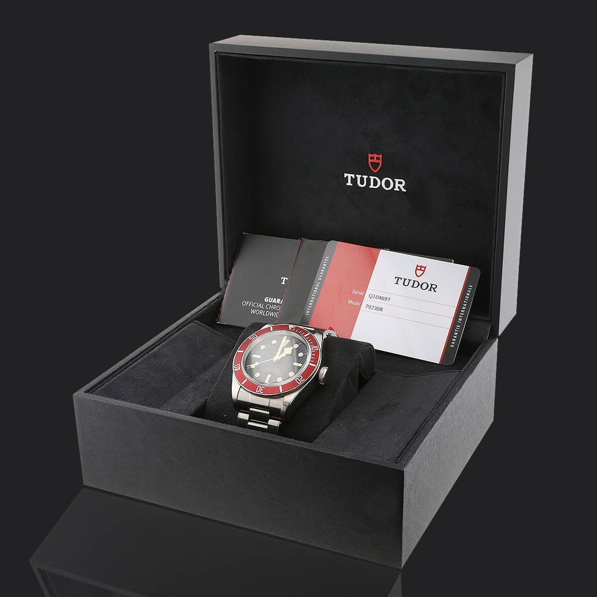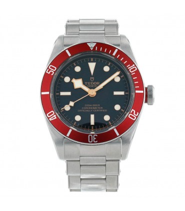 Montre bracelet d’homme en acier, cadran noir avec index luminescents, chemin de fer pour les minutes, lunette tournante émaillée graduée rouge. Mouvement automatique. Bracelet acier, maillons articulés en acier avec boucle déployante réglable en acier. Signée et numérotée réf 79230R.