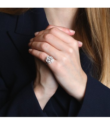 Bague en or blanc, stylisant une fleur de camélia ajourée ornée de diamants. Signée et numérotée.