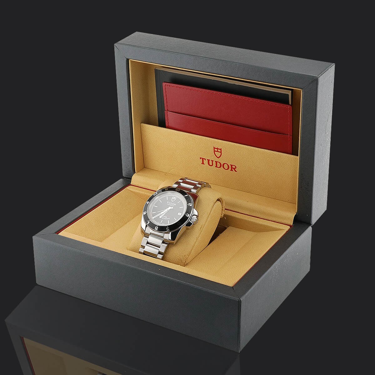 Montre bracelet d’homme en acier, cadran noir stylisé avec index appliqués, affichage de la date par guichet à 3 heures, lunette graduée noir avec léger manque à l’émail sur le 8 et le 9. Mouvement automatique. Bracelet acier, maillons articulés avec boucle déployante en acier. Signée et numérotée.