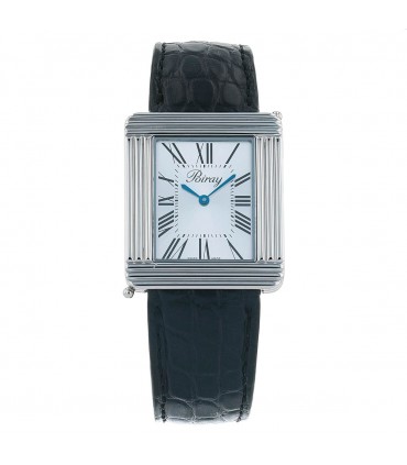 Montre bracelet grand modèle en acier, cadran argenté avec chiffres romains et index peints, lunette godronnée. Mouvement quartz. Bracelet interchangeable en crocodile noir avec boucle ardillon en acier. Signée et numérotée.