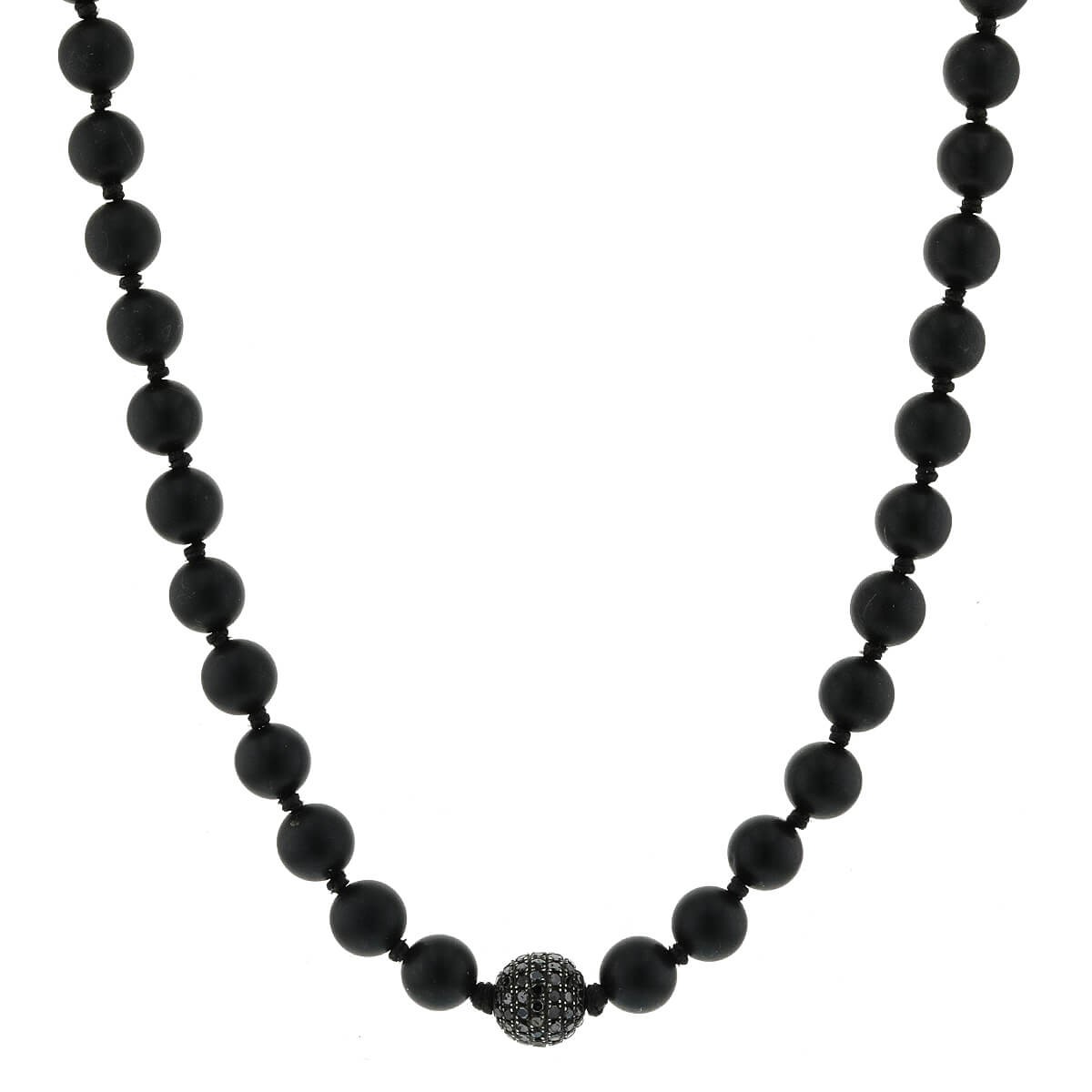 Collier composé d’un rang de perles noires en pierre ornemental de 8 mm de diamètre rehaussé d’un motif boule et d’un fermoir en argent pavés de diamants noirs. Signé.