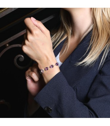 Bracelet en or blanc, les maillons articulés composés d’un camaïeu d’améthystes de différentes tailles dont une retenant en pampille un saphir, agrémenté d’un fermoir à cliquet ponctué d’un diamant avec sécurité. Siglé.