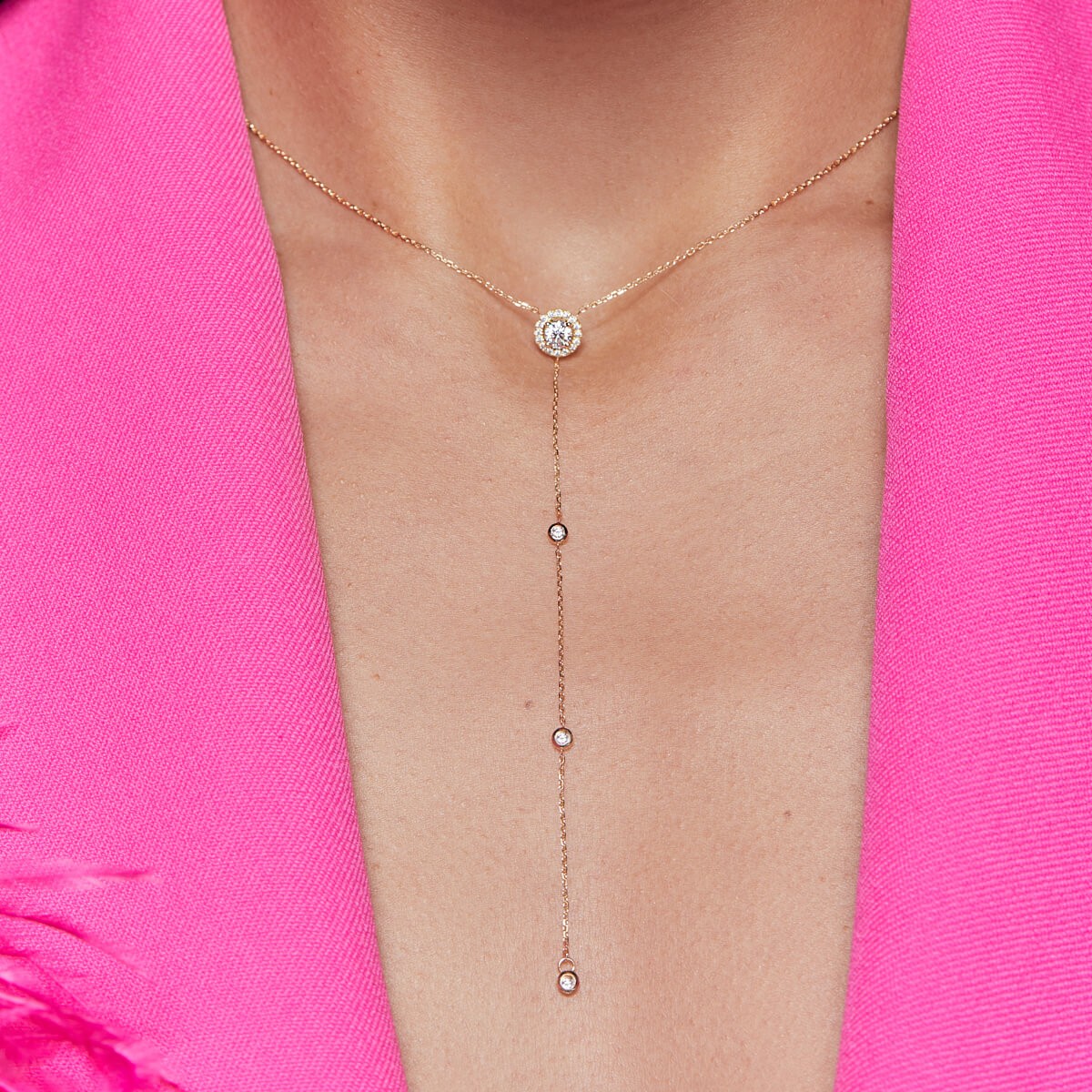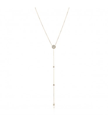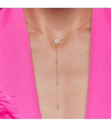 Collier en or jaune recyclé, maille forçat, orné un diamant upcyclé taille brillant de 0,30 ct dans un entourage diamanté retenant une chaîne ponctuée de 3 autres diamants upcyclés, agrémenté d’un fermoir mousqueton.