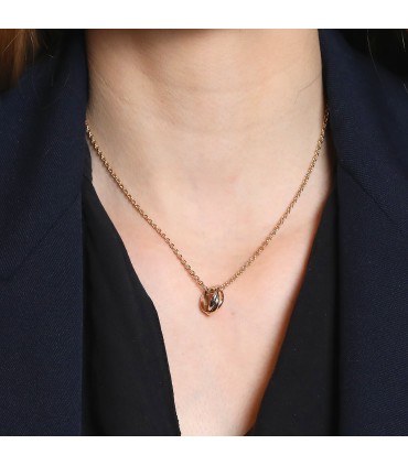 Collier en or jaune, maille forçat, retenant 3 anneaux entrelacés 3 tons d’or, agrémenté d’un fermoir anneau ressort avec chaînette de sécurité. Signé et numéroté.