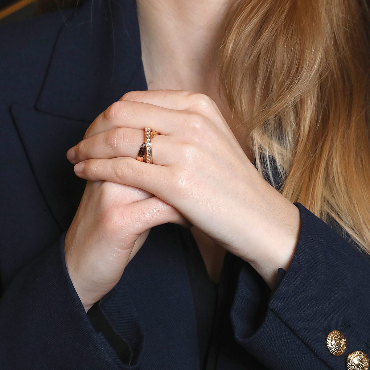 Bague en or rose, stylisant 2 anneaux entrelacés, ornée d’une ligne de diamants. Signée et numérotée.