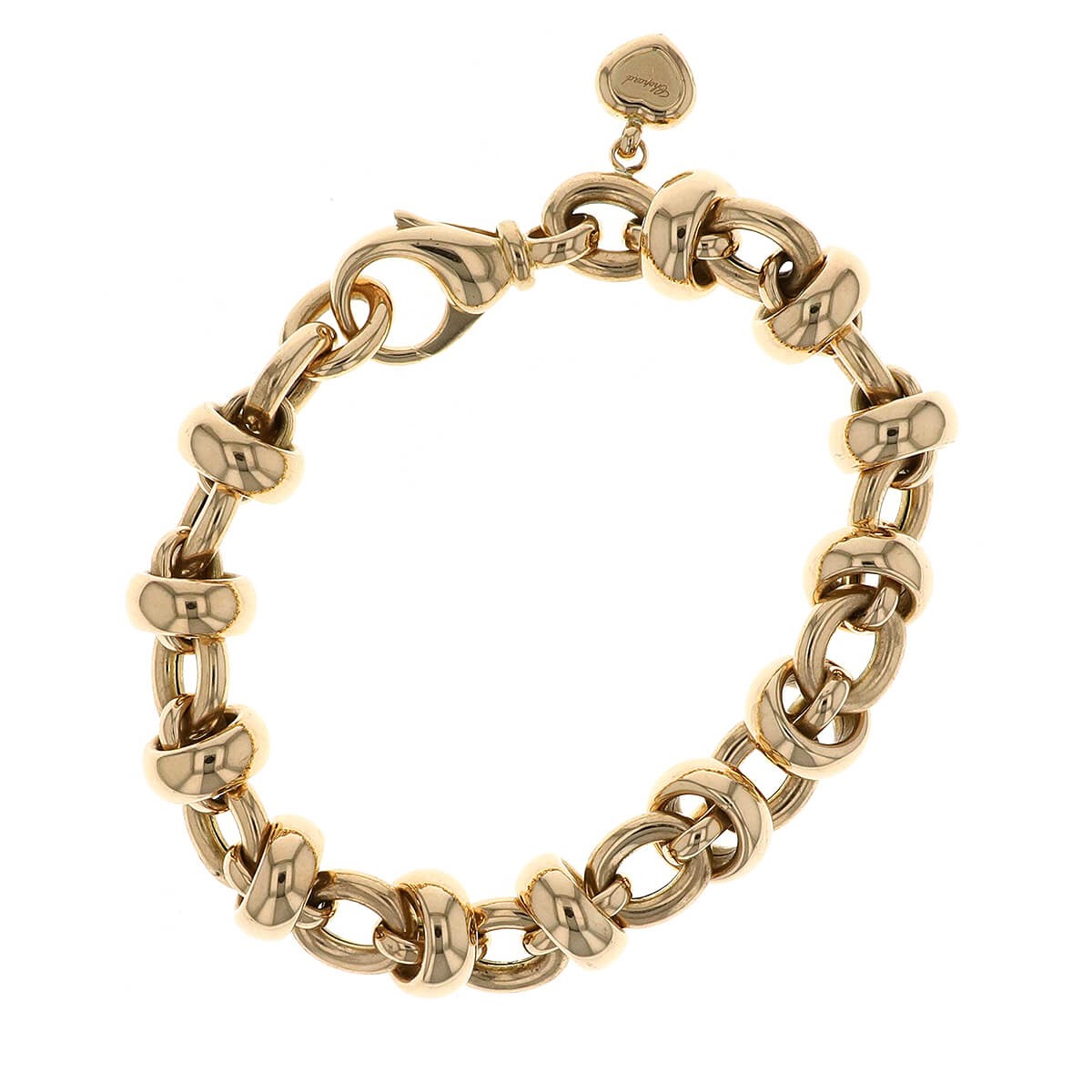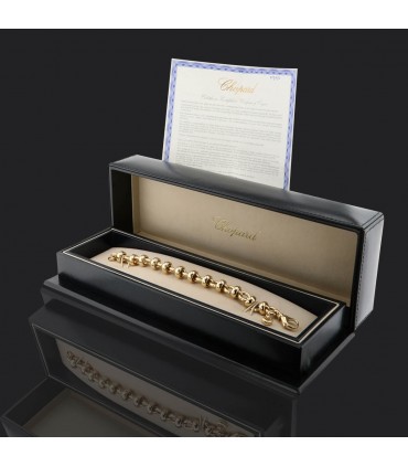 Bracelet en or jaune, chaîne chenille stylisée, agrémenté d’un fermoir gros mousqueton et d’un coeur en pendeloque. Signé et numéroté.