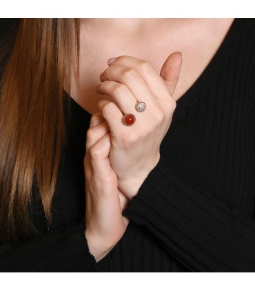 Bague entre les doigts en or rose, ornée d’une cornaline cabochon et d’un pavage de diamants dans un entourage perlé. Signée et numérotée.