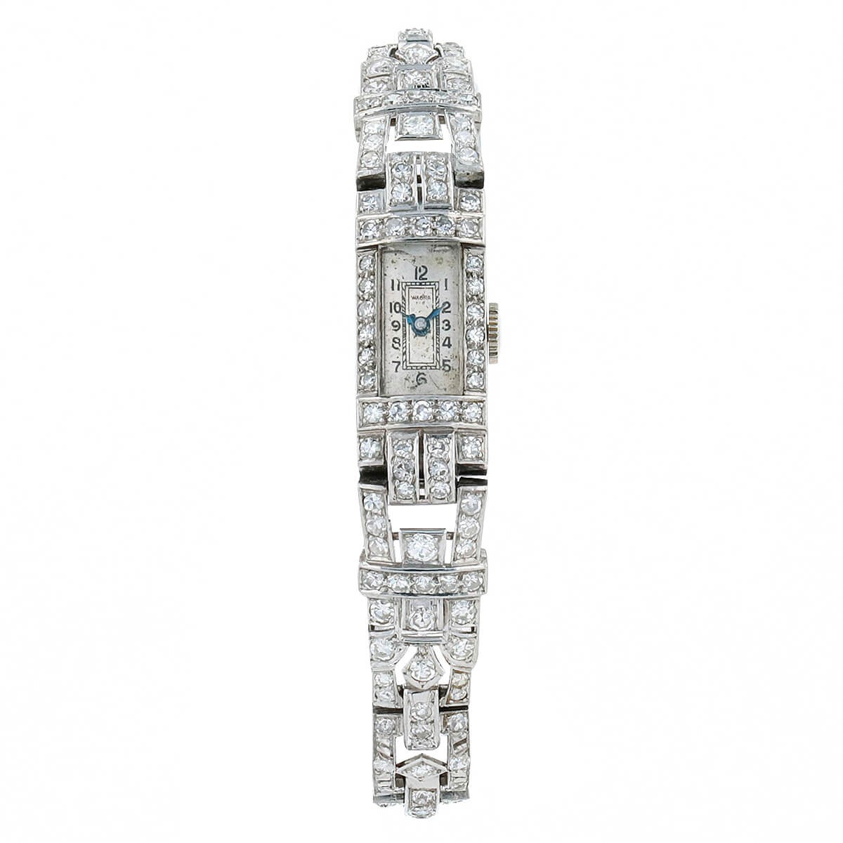 Montre bracelet de femme Art Déco en platine et diamants, cadran argenté patiné avec chiffres arabes peints, chemin de fer pour les minutes, lunette rectangulaire sertie de diamants, boîtier ciselé suivant des motifs végétaux. Mouvement mécanique. Bracelet composé de maillons géométriques serties de diamants avec fermoir à cliquet et chaînette de sécurité.