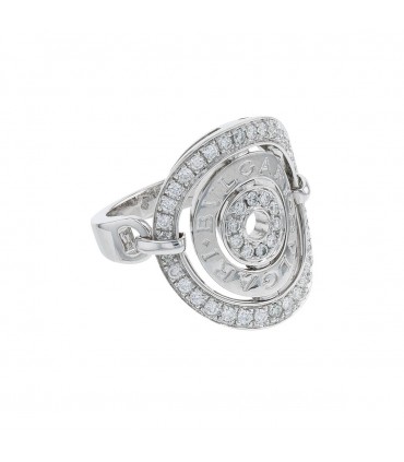 Bague en or blanc, ornée d'un motif ajouré mobile rehaussé de diamants et gravé ''Bvlgari''. Signée.