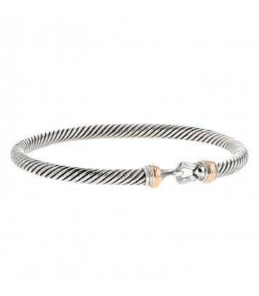 Bracelet rigide ouvert en argent, stylisant une torsade, les embouts en or jaune rehaussés d’un fermoir à crochet . Signé.