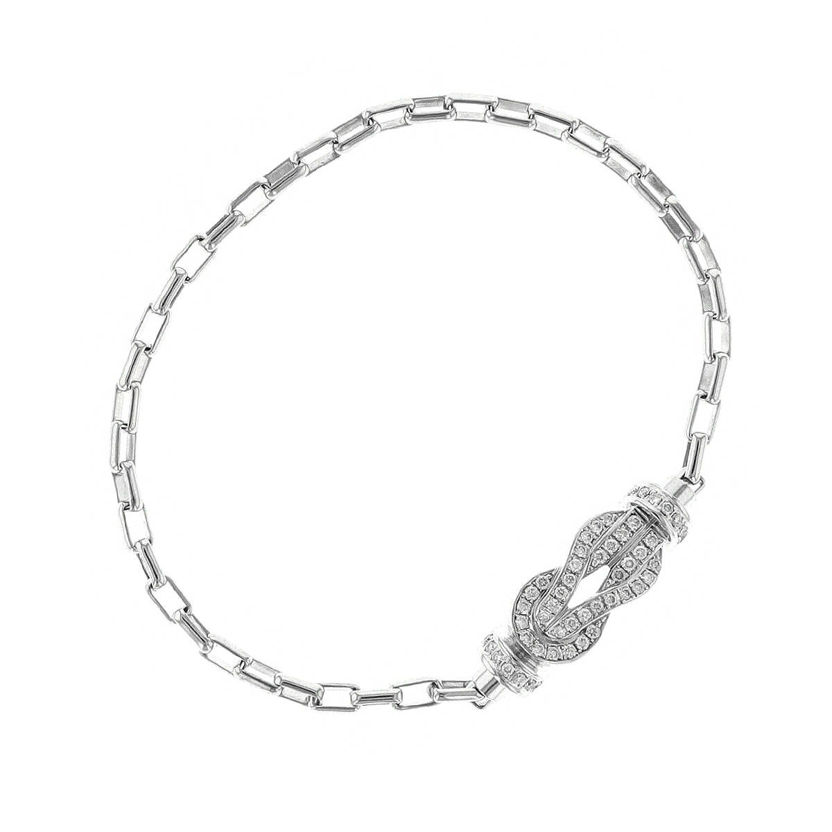 Bracelet moyen modèle stylisant un motif noeud d’hercule en or blanc rehaussé d’un pavage de diamants, retenu par une chaîne en or blanc interchangeable. Signé et numéroté.