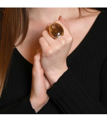 Bague en or jaune, ornée d’un important quartz cheveux de Vénus en serti clos.