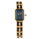 Montre bracelet de femme taille XL en métal plaqué or, cadran noir, lunette octogonale. Mouvement quartz. Bracelet cuir et métal doré, maillons articulés avec fermoir à cliquet. Signée et numérotée.