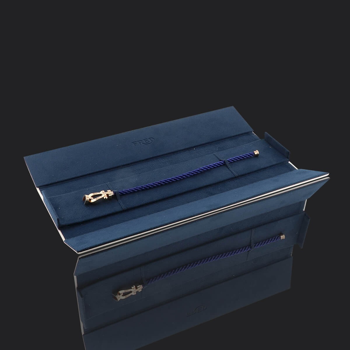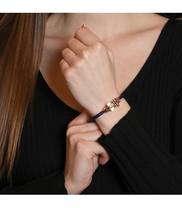 Bracelet grand modèle composé d’un câble amovible en corderie bleue indigo torsadé agrémenté d’un fermoir ajouré stylisant une manille en or rose. Edition limitée en collaboration avec la marque Sweet Pants. Signé et numéroté.