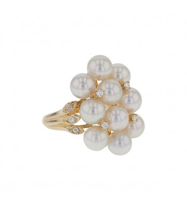 Bague en or jaune, ornée de 10 perles de culture d’environ 6 mm, ponctuées de diamants. Signée.