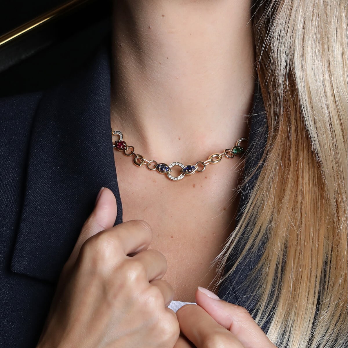 Collier en or jaune, composé de maillons géométriques ornés de diamants, rubis, saphirs et émeraudes ronds facettés. Signé.