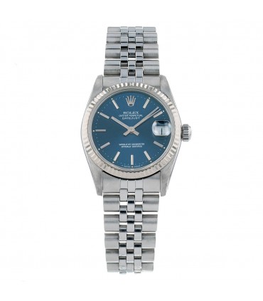 Montre bracelet de femme en acier, cadran bleu rayonnant avec index appliqués, chemin de fer pour les minutes, affichage de la date par guichet à 3 heures, lunette cannelée en or blanc. Mouvement automatique. Bracelet acier, maillons jubilé avec boucle déployante réglable en acier. Signée et numérotée réf. 68274.