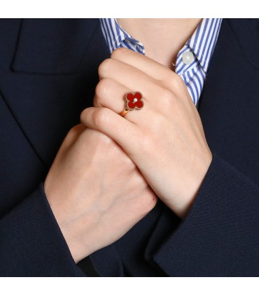 Bague en or jaune, stylisant le motif Alhambra en cornaline ponctué d’un diamant. Signée et numérotée.