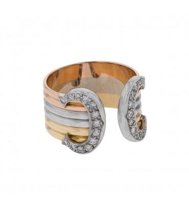 Bague ouverte 3 tons d'or, les embouts ornés du monogramme au double “C” de la maison Cartier rehaussé de diamants. Signée et numérotée.