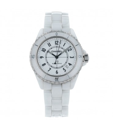 Montre bracelet en céramique blanche, cadran blanc avec chiffres arabes appliqués, chemin de fer pour les minutes, affichage de la date par guichet à 4 heures 30, lunette tournante graduée. Fond de boîte transparent dévoilant son mouvement automatique. Bracelet en céramique blanche, maillons articulés avec boucle déployante en acier. Signée et numérotée.