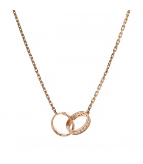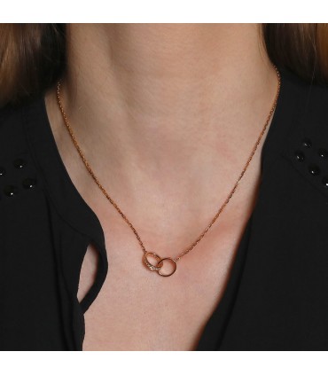 Collier en or rose, maille forçat, centré de 2 anneaux entrelacés, l’un à décor de vis et l’autre orné de diamants agrémenté d’un fermoir mousqueton. Signé et numéroté.