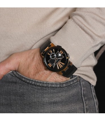 Montre bracelet d’homme en or rose, cadran noir avec index appliqués et chiffres romains surdimensionnés, lunette en céramique noire. Affichage de la date à 2 heures, petite trotteuse à 6 heures et double fuseau horaire indiqué par une fenêtre d’affichage des heures supplémentaires à 9 heures. Aiguilles et index luminescents. Fond de boîte transparent dévoilant son mouvement automatique. Bracelet en crocodile noir neuf avec boucle déployante réglable en or rose. Signée et numérotée.