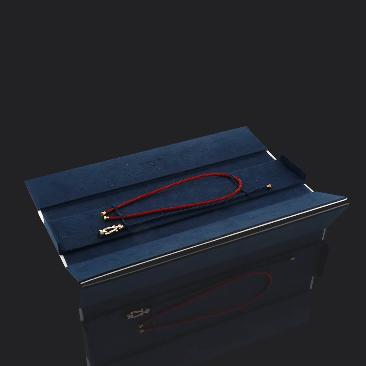 Bracelet moyen modèle, composé d’une manille en or rose et d’un câble amovible bleu. Signé et numéroté. Accompagné d’un bracelet supplémentaire double tour bordeaux.