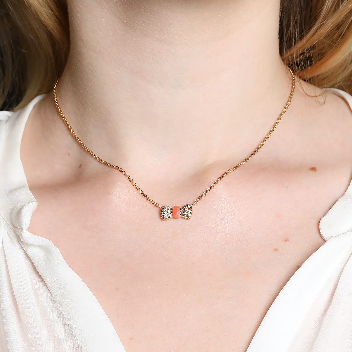 Collier en or jaune, orné d’un motif de noeud pavé de diamants avec le centre en corail rose, maille forçat agrémentée d’un fermoir anneau ressort. Signé et numéroté. Légère marque sur le corail.