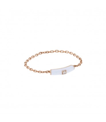 Bague en or rose, composée d’une fine chaîne maille forçat retenant un motif en émail blanc serti d’un diamant. Signée.