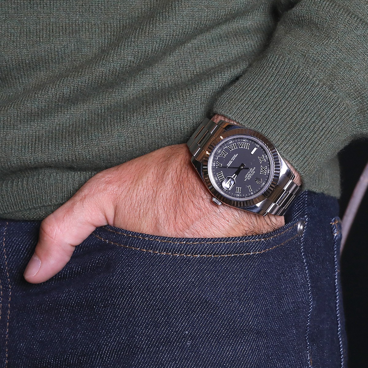 Montre bracelet d’homme en acier, cadran gris foncé avec chiffres romains appliqués, chemin de fer pour les minutes, affichage de la date par guichet à 3 heures, lunette cannelée en or blanc. Mouvement automatique. Bracelet en acier, maillons oyster avec boucle déployante réglable en acier. Signée et numérotée.