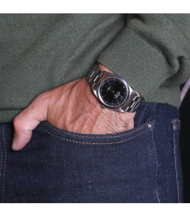 Montre bracelet en acier, cadran noir avec index appliqués. Mouvement automatique. Bracelet acier, maillons oyster avec boucle déployante réglable en acier. Signée et numérotée.