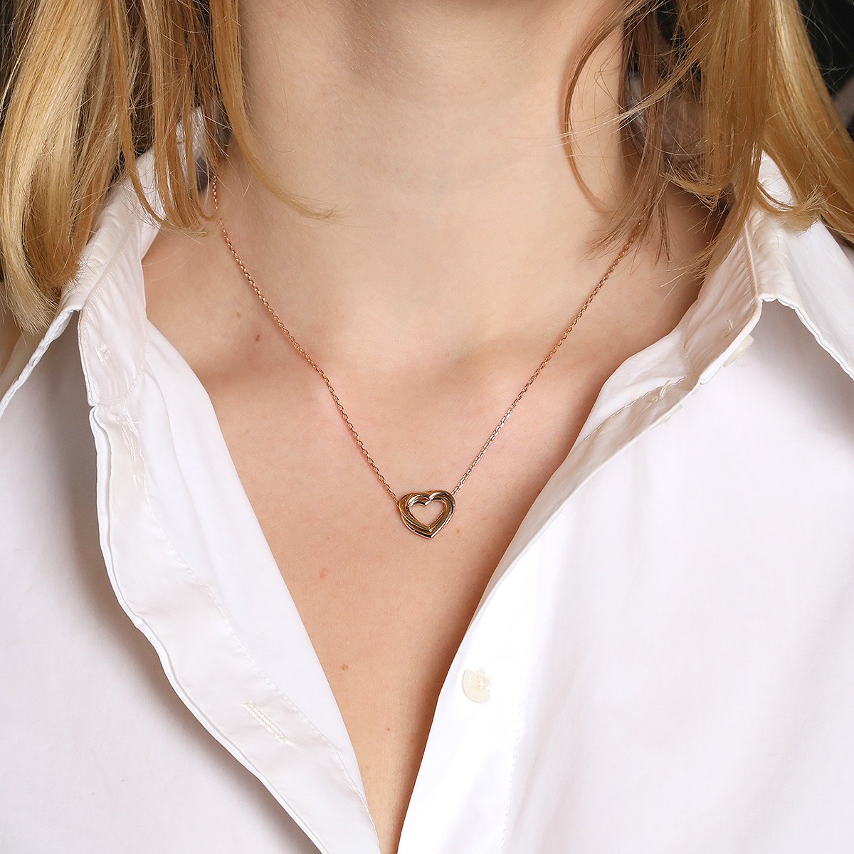 Collier 3 tons d’or, maille forçat, orné de 3 coeurs entremêlés, agrémenté d’un fermoir mousqueton avec longueur réglable. Signé et numéroté.