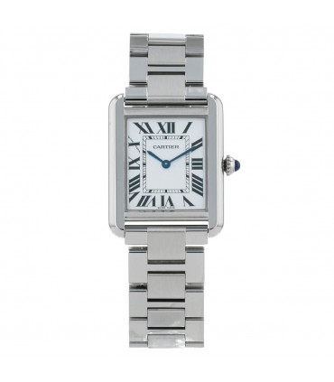 Montre bracelet en acier, cadran argenté avec chiffres romains et chemin de fer pour les minutes. Mouvement quartz. Bracelet en acier, maillons articulés avec boucle déployante en acier. Signée et numérotée.