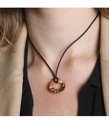 Pendentif en or jaune, à décor de cible ponctuée de diamants, retenu par un cordon noir. Signé.