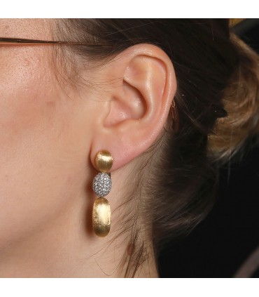 Boucles d’oreilles en or jaune brossé, composé de deux perles d’or centrées d’une perle pavée de diamants. Signées.