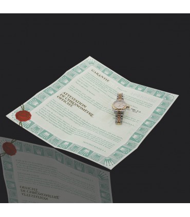 Montre bracelet de femme en or jaune et acier, cadran crème stylisé avec chiffres romains appliqués, chemin de fer pour les minutes, affichage de la date par guichet à 3 heures, lunette cannelée en or jaune. Mouvement automatique. Bracelet en or jaune et acier, maillons jubilé avec boucle déployante réglable en acier. Signée et numérotée.