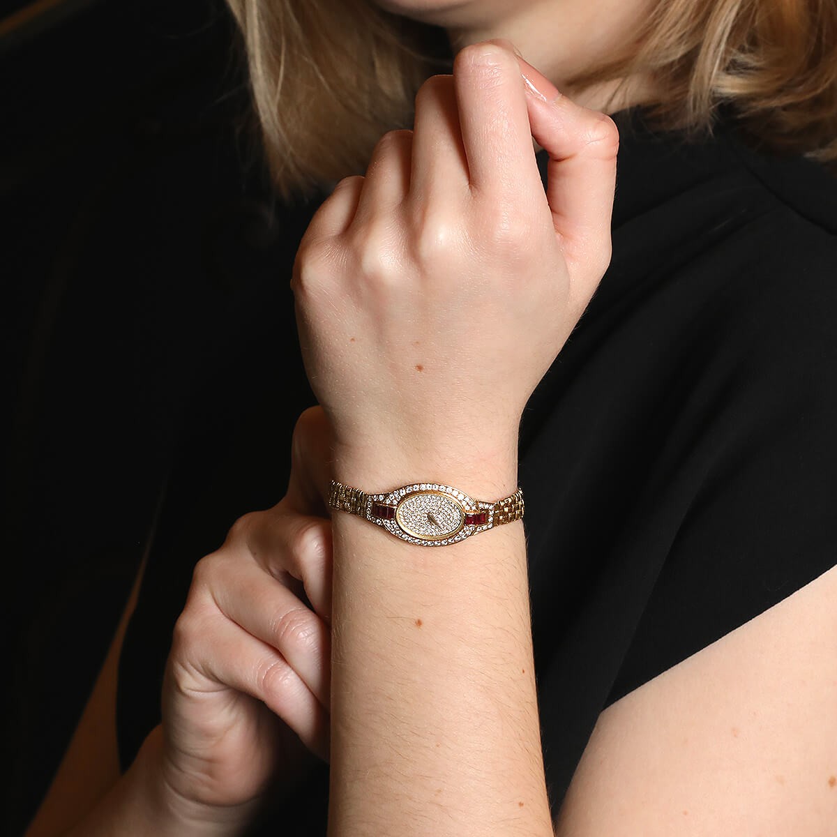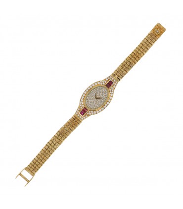 Montre bracelet de femme en or jaune, cadran muet pavé de diamants, lunette sertie de diamants ponctuée de six rubis taille baguette, remontoir sous boîtier. Mouvement mécanique. Bracelet or jaune, maillons articulés tressés avec fermoir à cliquet. Signée et numérotée.
