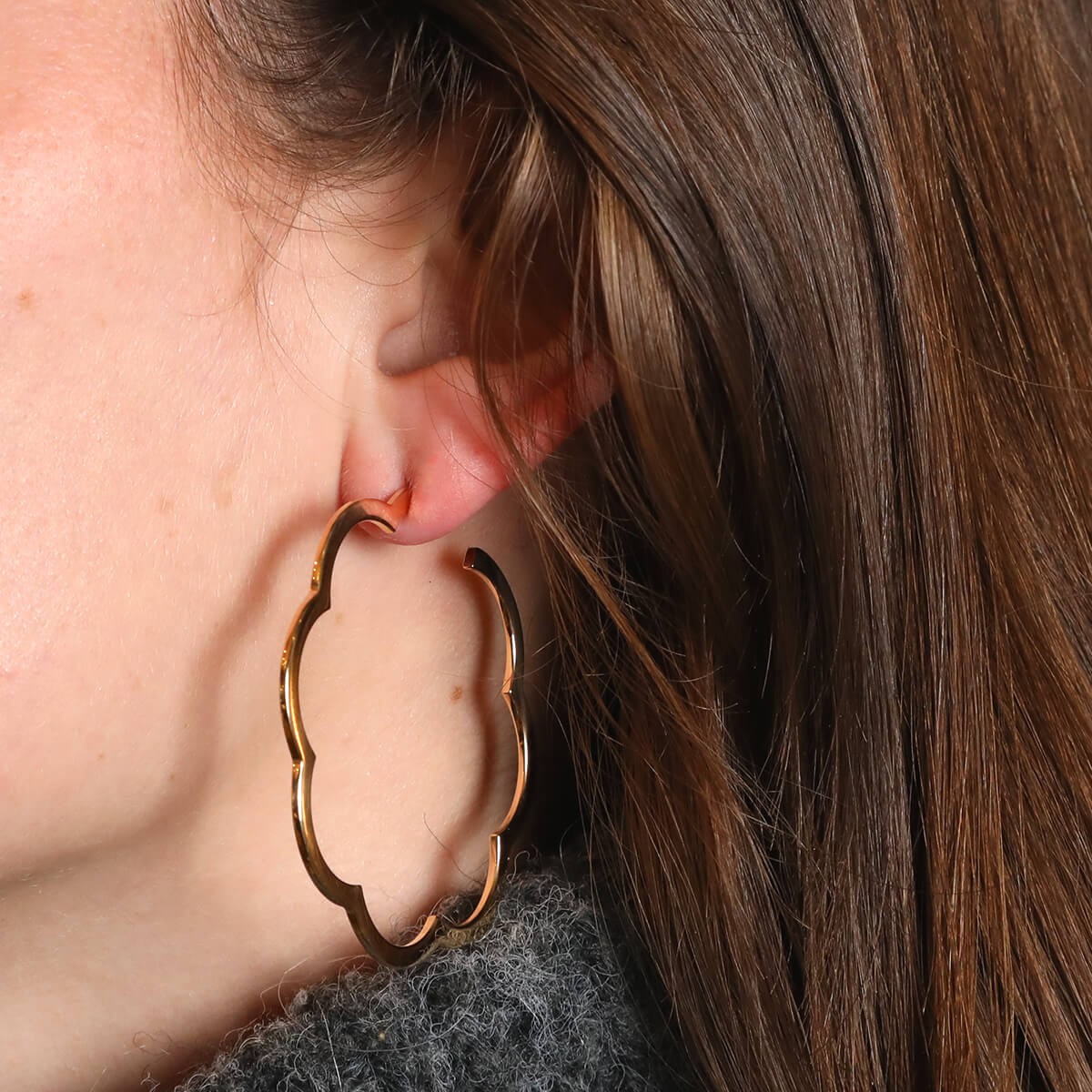 Boucles d’oreilles créoles en or jaune, stylisant le profil d’une fleur de camélia. Signature et numéros effacés, seul le “C” de Chanel et le “750” est visible.