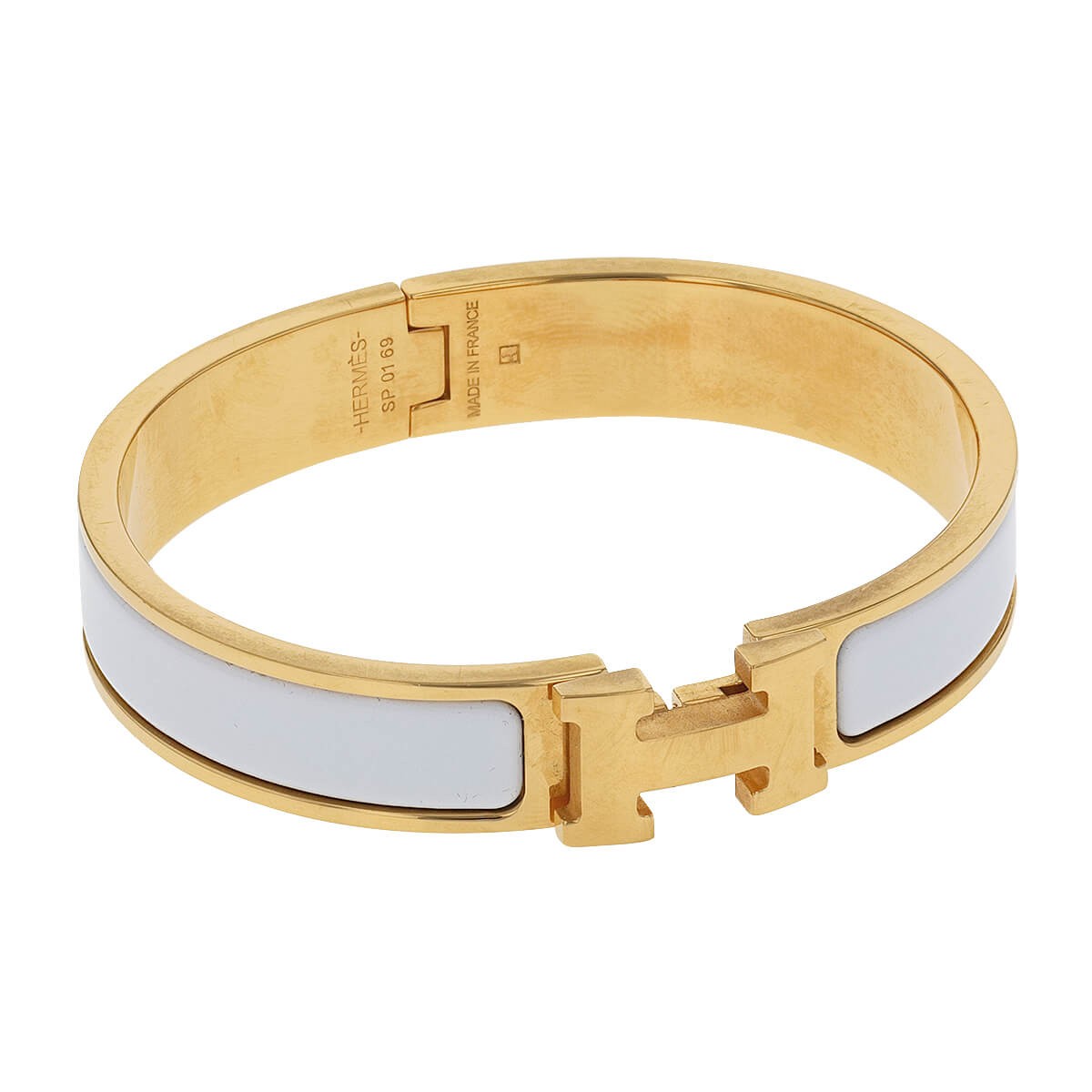 Bracelet en acier plaqué or, centré d’un fermoir en forme de H épaulé de deux bandes d’émail blanc. Signé et numéroté.