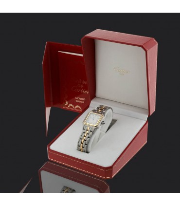 Montre bracelet moyen modèle en or jaune et acier, cadran argenté avec chiffres romains peints, chemin de fer pour les minutes, affichage de la date par guichet à 5 heures. Mouvement quartz. Bracelet 1 rang d’or jaune et acier, maillons articulés avec boucle déployante en acier. Signée et numérotée.