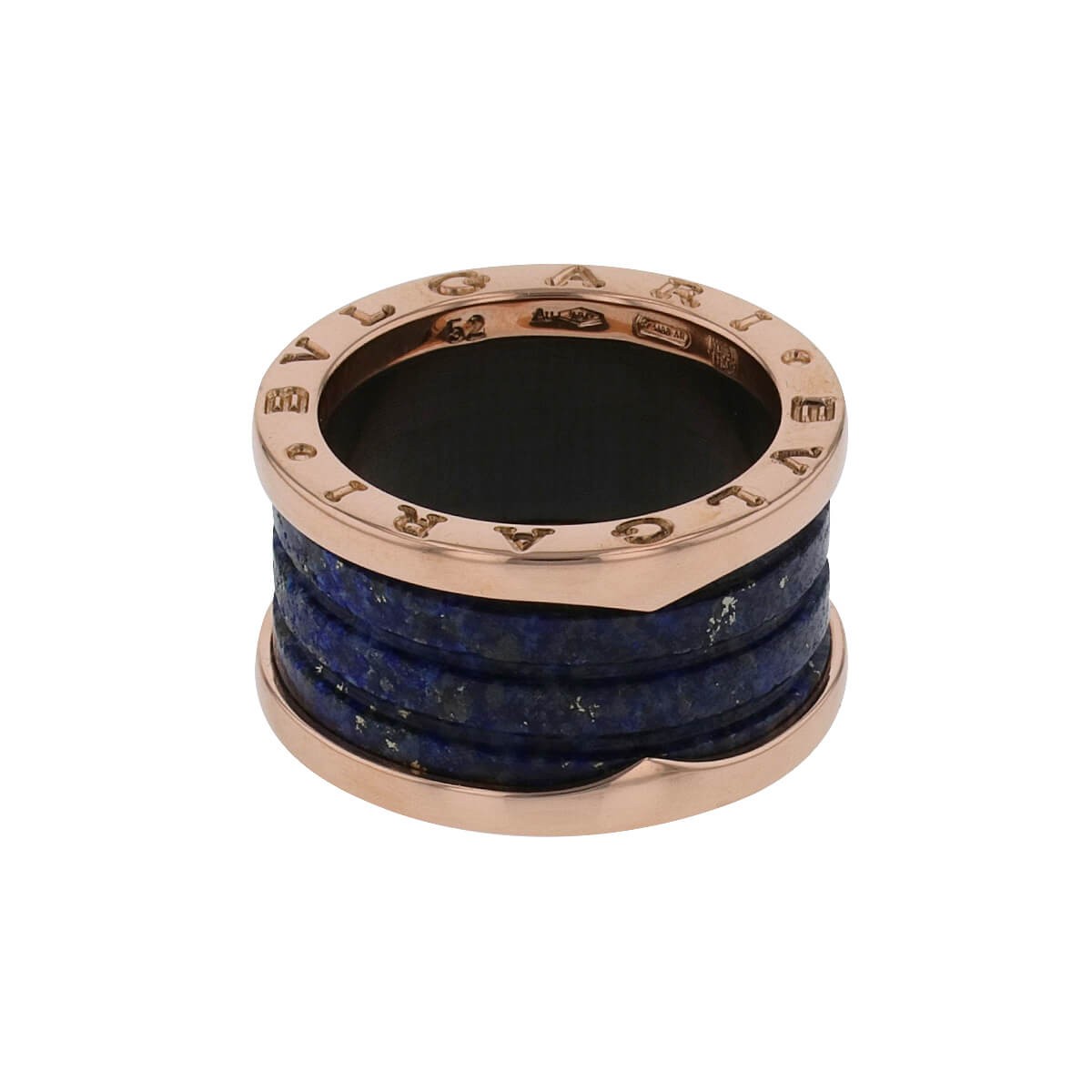 Bague en or rose et lapis lazuli, stylisant un large anneau en spirale gravé Bvlgari. Signée et numérotée.